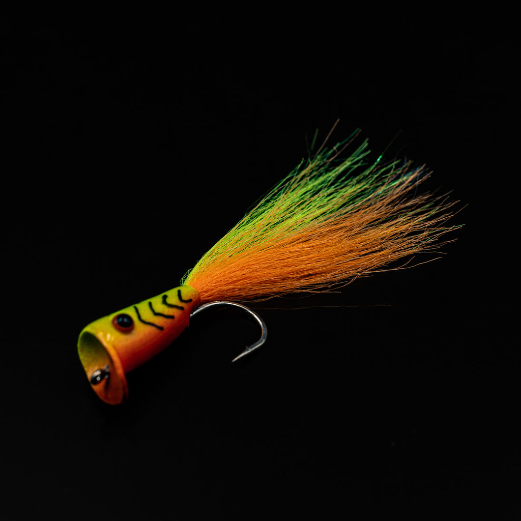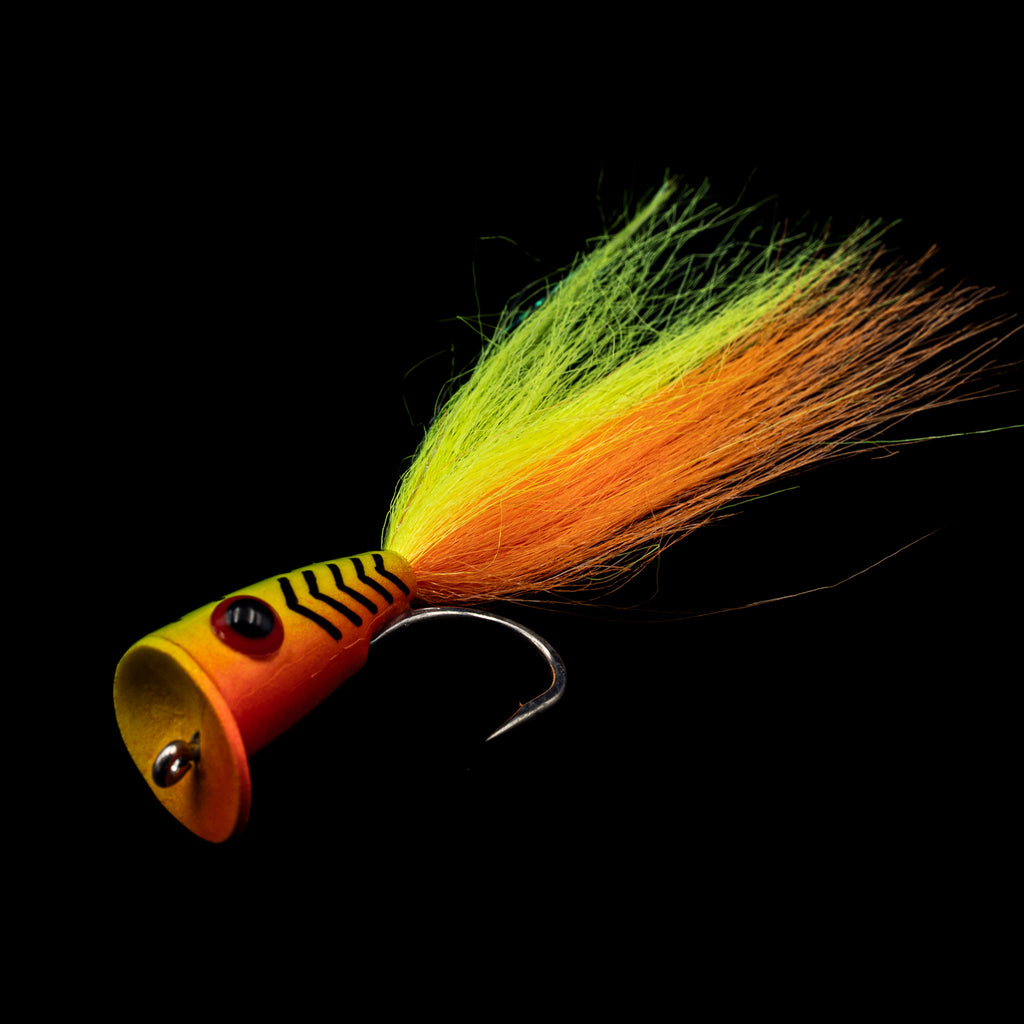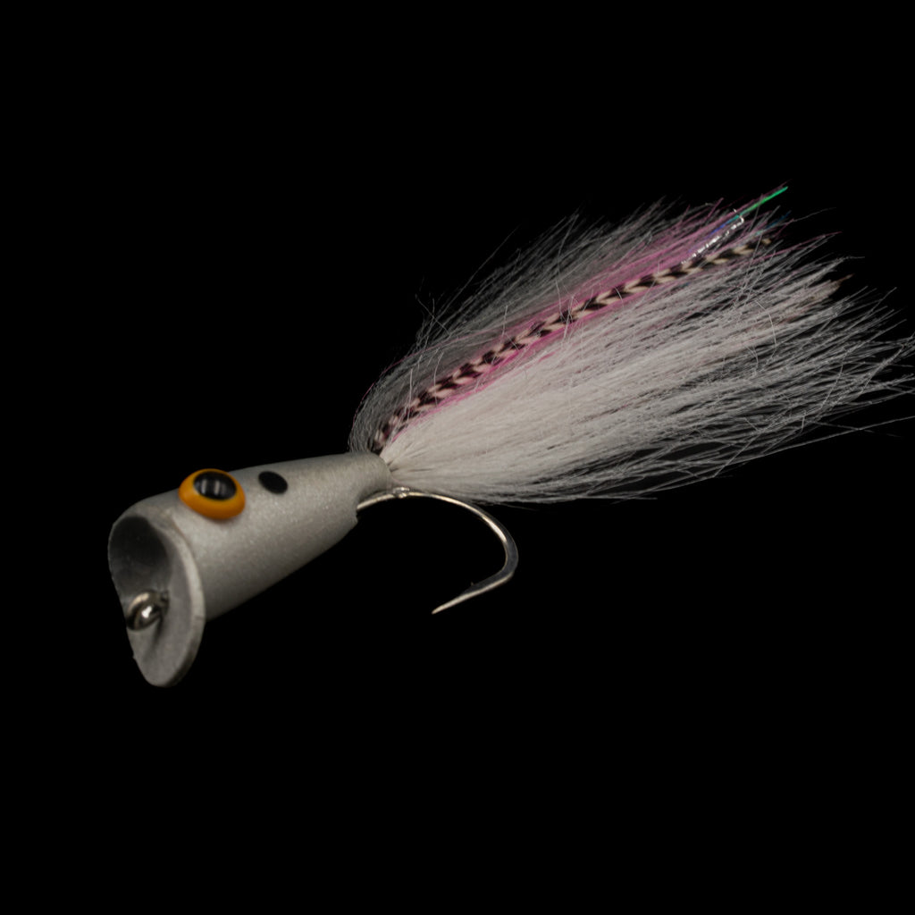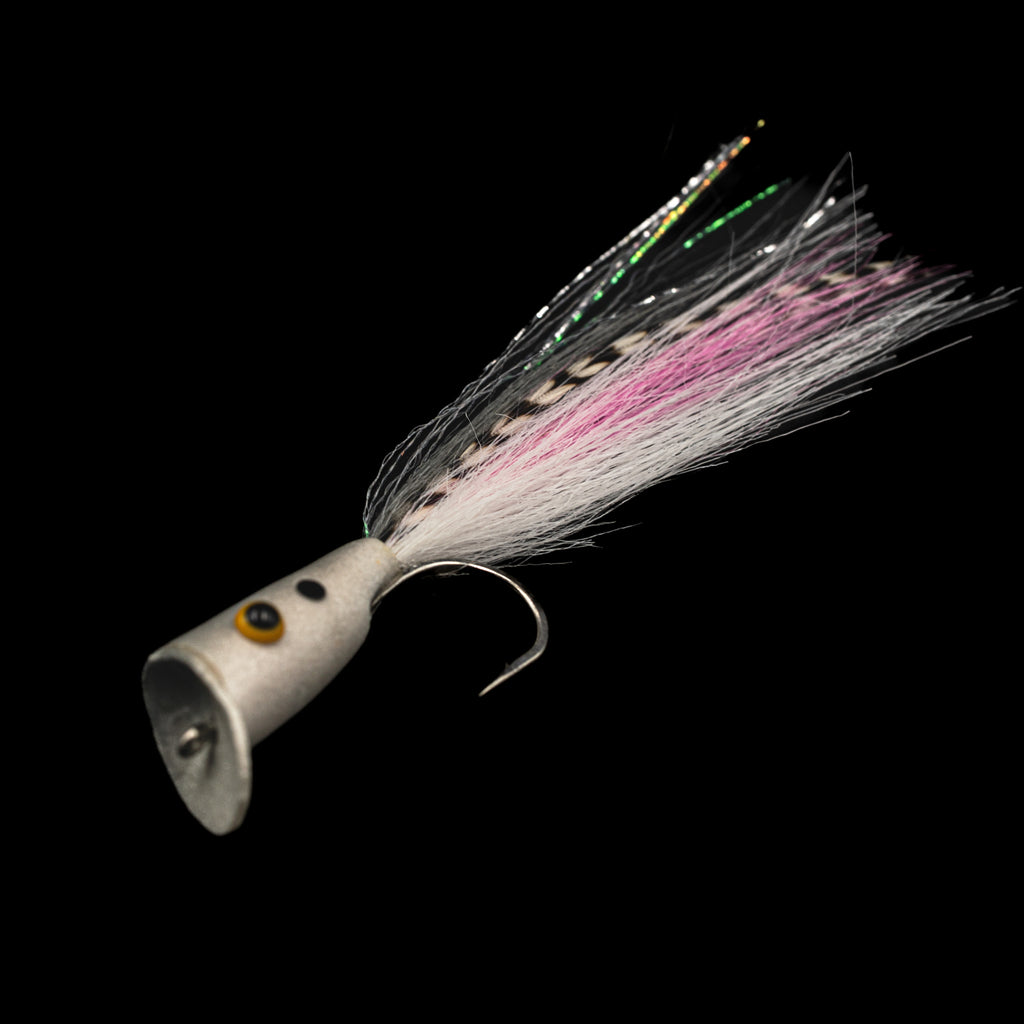 Built on size #1 or a beefed-up 3/0 saltwater hook, this fly pops hard, lands light, and walks the walk. With a tapered, slightly keeled body and a flared cup face, the Strip Tease throws water without throwing your cast. Each color is carefully chosen for visibility, contrast, and fish rage-induction.