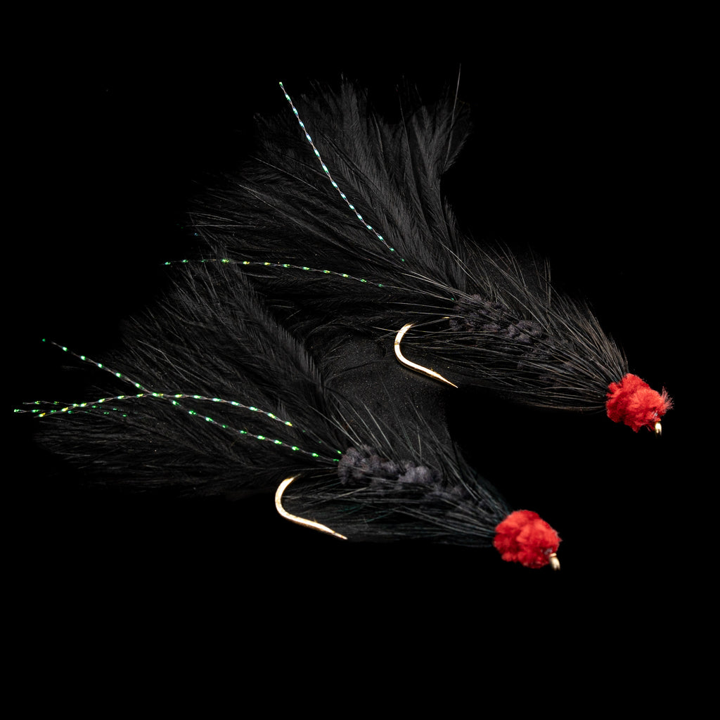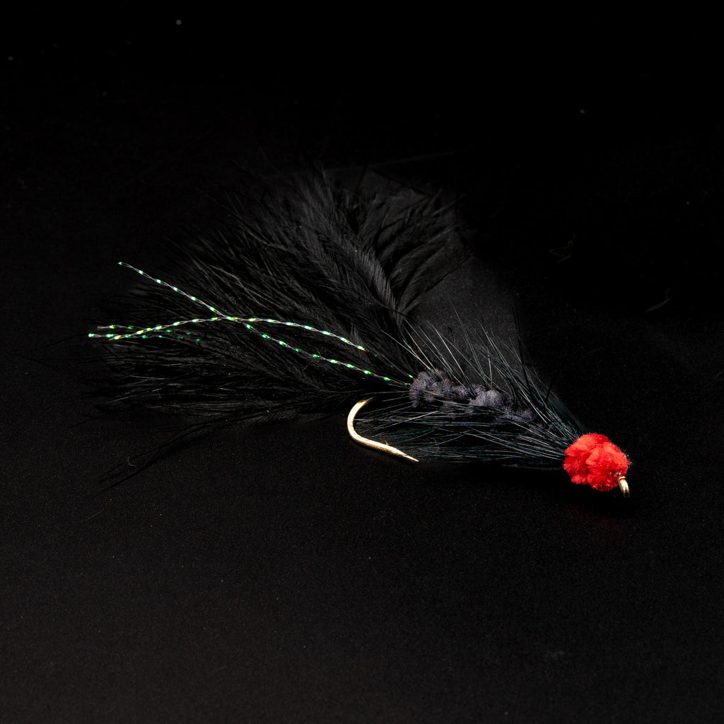 The bright red “egg” head draws strikes in any light, while the flowing black body delivers the perfect silhouette for trout, steelhead, and salmon that are keyed in on leeches or egg drift. It’s one of those flies that just plain gets eaten — deep pools, moving current, or stillwater alike.